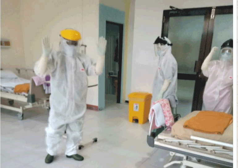 Dalam foto itu terlihat 5 orang tenaga medis di RSBP Batam yang menggunakan alat pelindung diri lengkap (APD) dan sedang membersihkan ruangan isolasi serta membereskan ranjang tempat tidur pasien Covid-19.