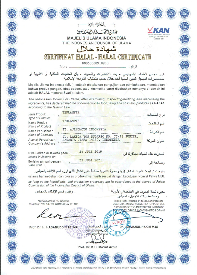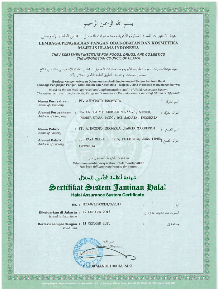 “Saat ini Ajinomoto Indonesia tidak hanya mengantongi sertifikat halal tapi juga memperoleh Sistem Jaminan Halal yang merupakan bentuk komitmen kami dalam memberika produk-produk yang halal untuk negara-negara Islam di Timur Tengah,” terang Indra dalam surelnya.