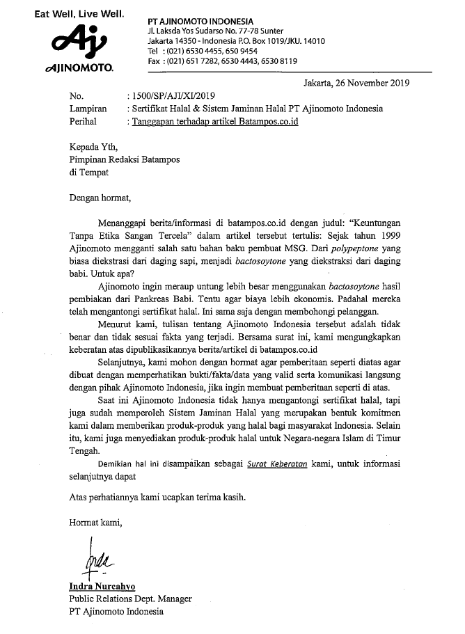 Untuk itu pada kesempatan ini kami memohon maaf kepada PT Ajinomoto Indonesia dan pembaca sebab telah memuat artikel tersebut.