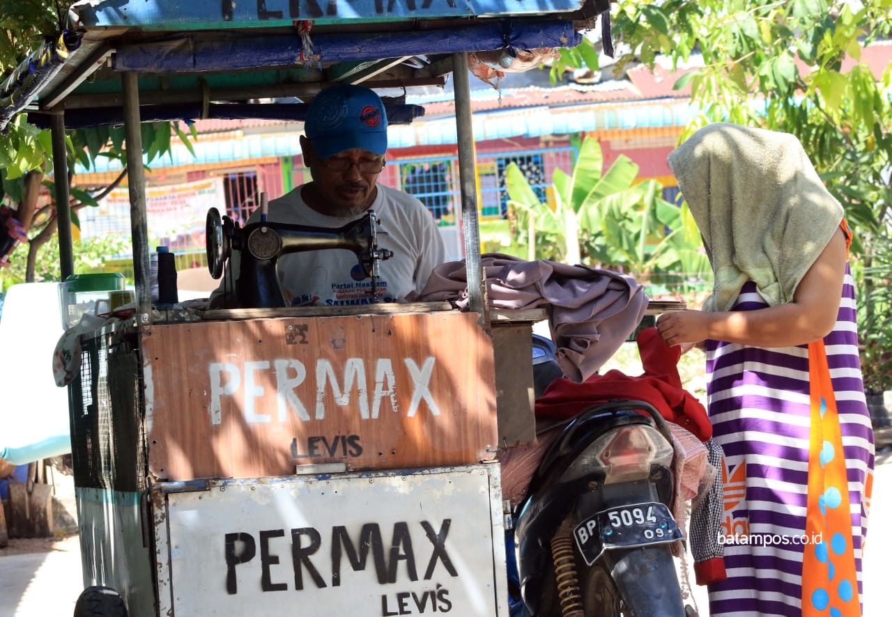 Aripin Nasution, tidak patah semangat untuk mencari nafkah ditengah pandemi Covid-19. Pria 65 tahun itu terus berkeliling mengitari beberapa area di Kota Batam yang ingin menggunakan jasanya sebagai penjahit keliling.