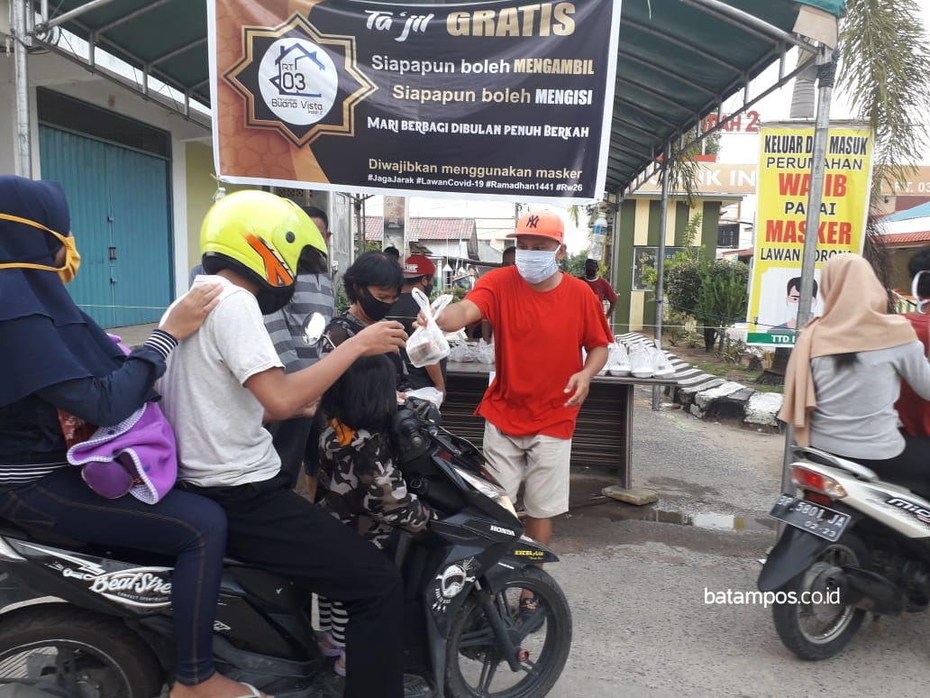 batampos.co.id – Warga Perumahan Buana Vista 2, Batam Kota, membagikan takjil atau makanan berbuka secara gratis kepada masyarakat yang melintas di depan pintu gerbang perumahan mereka.