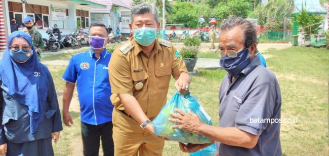 Bupati Kepulauan Anambas, Abdul Haris dalam penyerahan simbolis bantuan paket sembako bersama Persatuan Wartawan Indonesia (PWI) Anambas di Halaman Kantor Dinas Kesehatan KKA, Senin ( 18/5/2020). ( Foto : Faidillah /batampos.co.id).