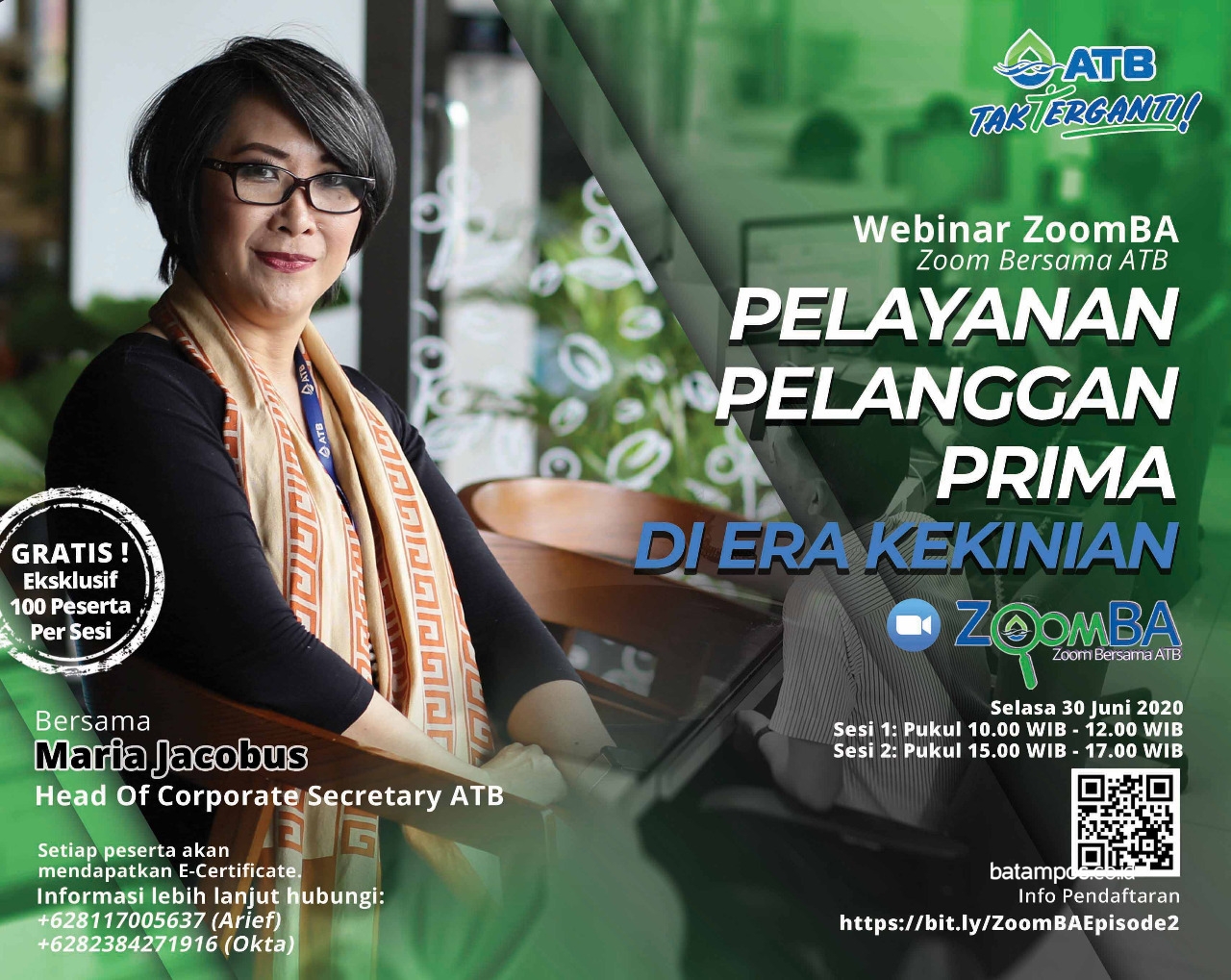 batampos.co.id – Webinar Zoom Bersama ATB (ZoomBA) kembali hadir, setelah menuai kesuksesan pada episode perdananya. Kali ini, ZoomBA akan membahas mengenai pelayanan pelanggan prima di era kekinian. Head of Corporate Secretary ATB, Maria Jacobus akan menjadi narasumbernya.