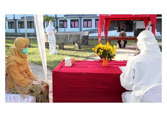 Sekitar 5 meter dari tempat AF, pria tersebut, duduk, juga di bawah naungan tenda, seorang perempuan, MRA, yang berbusana kebaya oranye telah menunggu. Seorang penghulu kemudian datang. Mengenakan alat pelindung diri (APD). Buku hijau dan merah dikeluarkan.