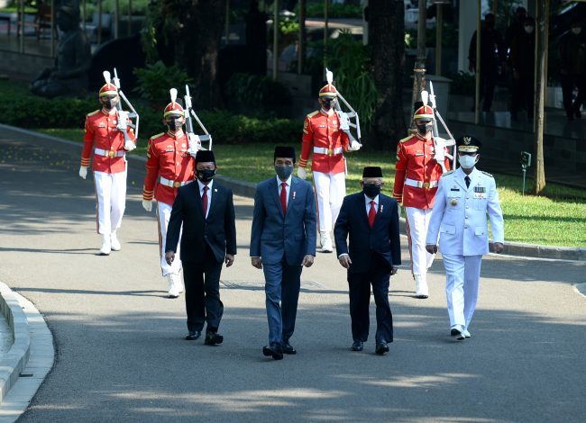 Di sebelah Ma’ruf, melangkah gagah Presiden Joko Widodo. Posisi paling ujung di samping Jokowi ada Menteri Dalam Negeri Prof Tito Karnavian. Mereka melangkah diiringi empat Paspampres berbaju merah dengan peralatan lengkap.