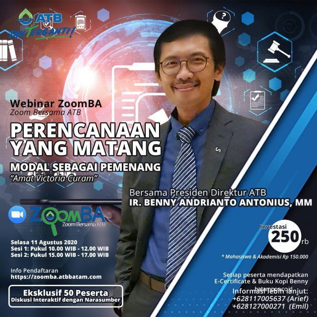 ZoomBA akan membahas “Perencanaan Yang Matang Modal Sebagai Pemenang – Amat Victoria Curam”, bersama Presiden Direktur ATB, Ir. Benny Andrianto Antonius, MM. Webinar ini akan diselenggarakan pada Selasa, 11 Agustus 2020 mendatang.