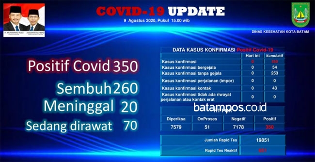 Pasien Covid-19 di Batam, 350 positif, 260 Sembuh, 20 Meninggal Dunia