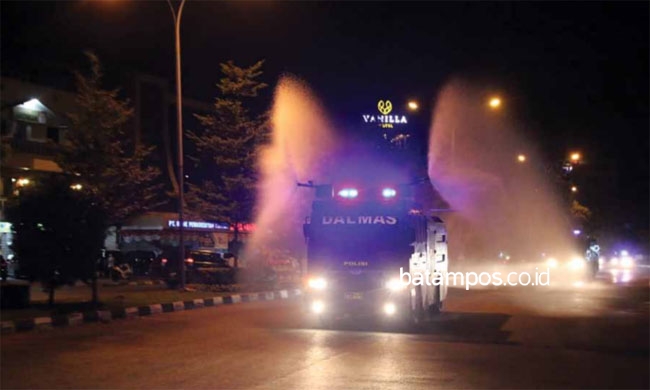 batampos.co.id – Satuan Sabhara Polresta Barelang menyemprotkan disinfektan ke jalan-jalan protokol di wilayah Lubuk Baja dan Batuampar, Jumat (28/8/2020) dini hari.