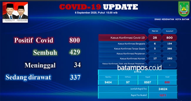 Dengan adanya penambahan tersebut saat ini total jumlah warga Kota Batam yang terkonfirmasi positif Covid-19 sebanyak 800 orang.
