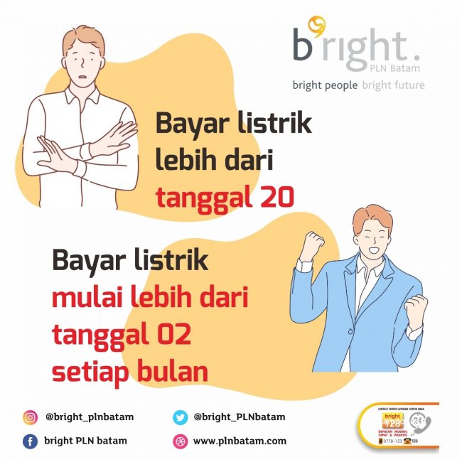 “Batas waktu bayar listrik adalah tanggal 20 setiap bulannya, apabila pelanggan sampai dengan tanggal 20 belum melakukan pembayaran tagihan listrik, maka tanggal 21 pada bulan yang sama pelanggan akan dikenakan sanksi biaya keterlambatan dan dilakukan pemutusan sementara ” tuturnya.