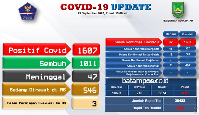 Hingga Selasa (29/9/2020), total jumlah pasien Covid-19 di Kota Batam yang dinyatakan sembuh sebanyak 1.011 orang.