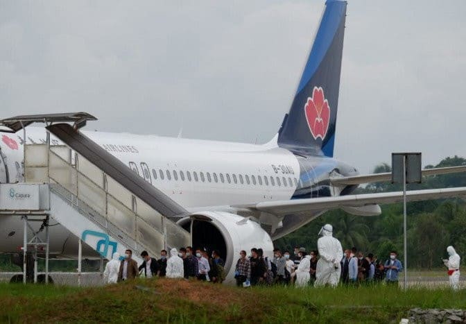 Sejumlah petugas medis dari Kantor Kesehatan Pelabuhan (KKP) Kelas II Tanjung Pinang berpakaian lengkap alat pelindung diri (APD) siaga menyambut kedatangan para TKA tersebut. Satu per satu TKA yang turun dari pesawat diperiksa suhu tubuh, diwajibkan mengisi e-Hac, menjalani tes cepat, dan menunjukkan hasil tes usap dengan hasil negatif dari negara asal.