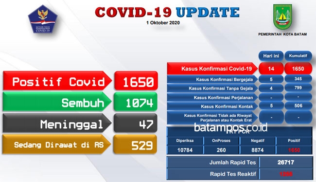 Ketua Bidang Kesehatan Gugus Tugas Covid-19 Kota Batam, Didi Kusmarjadi, melalui pernyataan tertulisnya menyebutkan, pada Kamis (1/10/2020) ada 14 orang warga Kota Batam yang dinyatakan positif Covid-19.