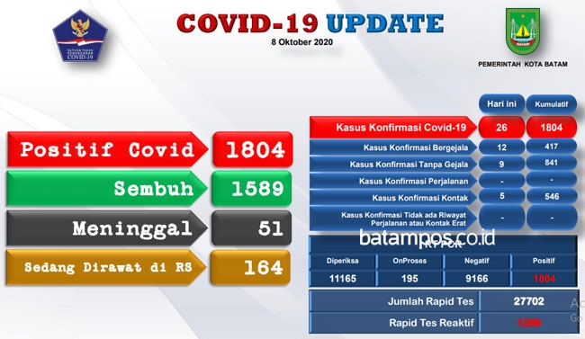 Sementara warga Batam yang dinyatakan positif berjumlah 1.804 orang.
