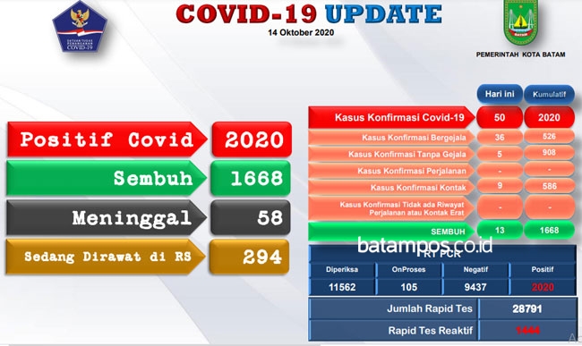 Pada rabu (14/10/2020), terdapat 50 warga Kota Batam yang dinyatakan positif Covid-19. Dengan adanya penambahan tersebut saat ini total jumlah warga Kota Batam yang terkonfirmasi positif Covid-19 mencapai 2020 orang.