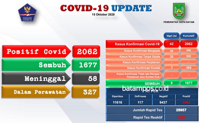 batampos.co.id – Hingga Kamis (15/10/2020) diketahui ada 885 karyawan swasta di Kota Batam yang terkonfirmasi positif Covid-19.