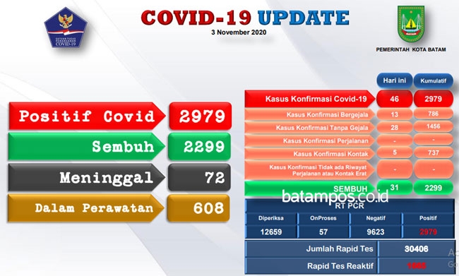 Dengan adanya penambahan tersebut total jumlah warga Kota Batam yang terkonfirmasi positif Covid-19 hingga Selasa (3/11/2020) sebanyak 2.979 orang.