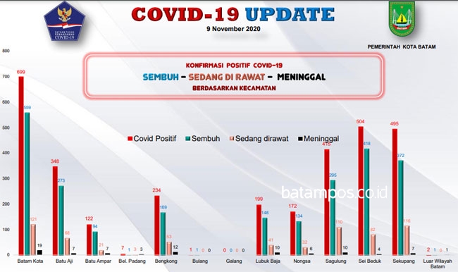 Dilansir dari website lawancorona.batam.go.id, hingga Senin (9/11/2020) diketahui ada 699 warga Kecamatan Batam Kota yang positif terjangkit virus tersebut.