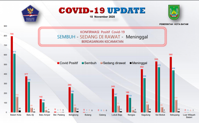 Dari jumlah tersebut 91 orang dinyatakan meninggal dunia. Dari 12 Kecamatan di Kota Batam hanya satu yang masih zona hijau yaitu Galang.