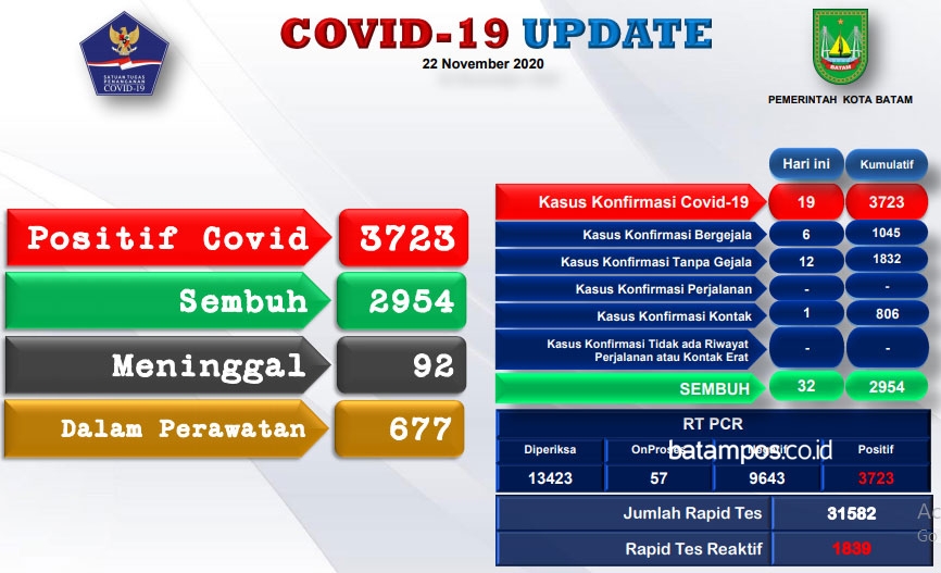 Dilansir dari website lawancorona.batam.go.id diketahui total jumlah pasien Covid-19 hingga Minggu (22/11/2020) sebanyak 3.723 orang.
