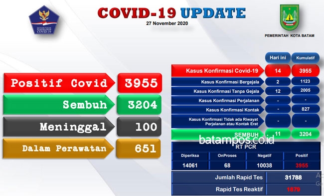 Jumlah pasien Covid-19 Kota Batam hingga Jumat (27/11/2020).