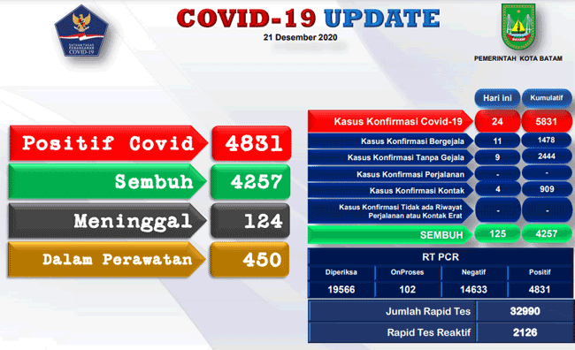 batampos.co.id – Jumlah kasus Covid-19 di Kota Batam terus bertambah dan pada Senin (21/12/2020) terdapat 24 warga Batam yang terkonfirmasi Covid-19.