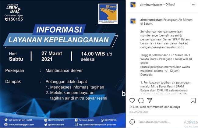 Hal ini sehubungan adanya pekerjaan pemeliharaan dan penyempurnaan Server SPAM Batam pada Sabtu (27/3/2021).