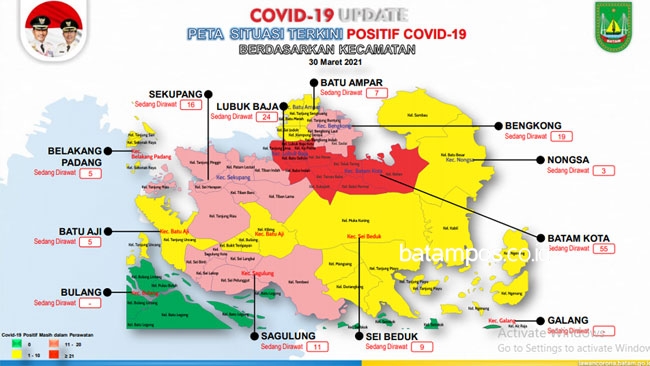 Sedangkan lima kecamatan lain di mainland yakni, Batuaji, Sagulung, Batuampar, Seibeduk dan Nongsa berstatus zona kuning.