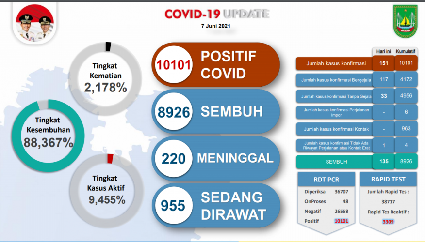 Penambahan pasien Covid-19 di Kota Batam terjadi kembali pada Senin (7/6/2021) yakni sebanyak 151 orang.