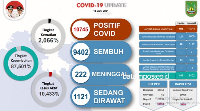 Dengan adanya penambahan tersebut saat ini total jumlah pasien Covid-19 di Batam sebanyak 10.745 orang.