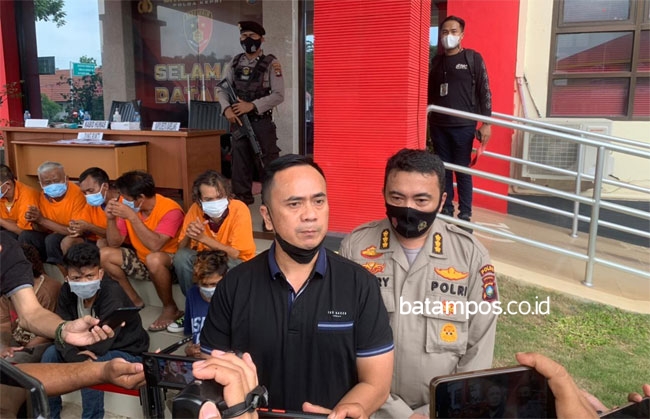 Direktur Reserse Kriminal Umum Polda Kepri, Kombes Jefri Siagian (kaos hitam) memberikan keterangan kepada wartawan terkait penangkapan pelaku premanisme di Kota Batam. Foto: Humas Polda Kepri