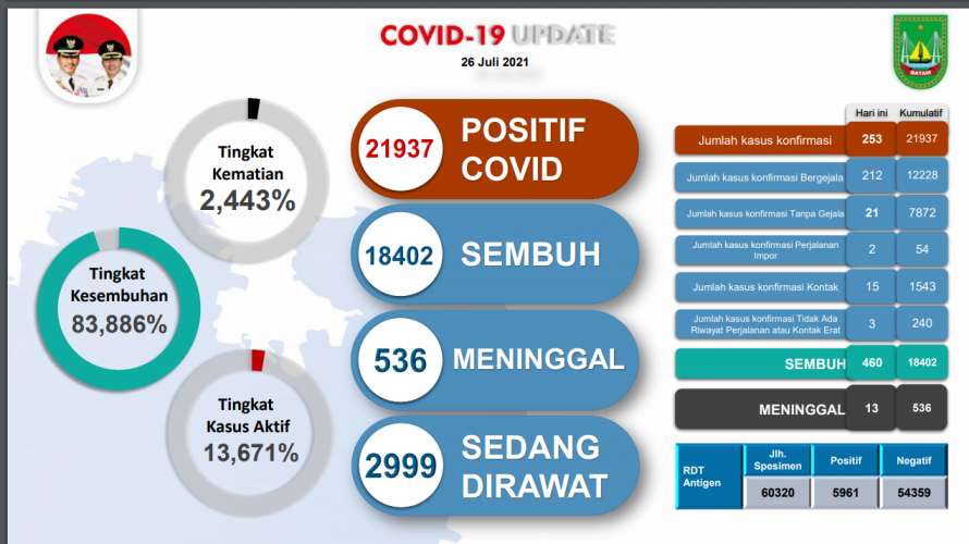Dengan adanya penambahan tersebut saat ini jumlah pasien Covid-19 di Kota Batam sebanyak 21.937 orang.