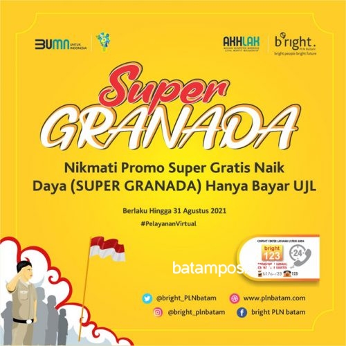 batampos.co.id – bright PLN Batam menggelar program promosi Super Gratis Naik Daya (SUPER GRANADA), dalam rangka menyambut Hari Kemerdekaan Republik Indonesia yang ke-76 pada 17 Agustus 2021.