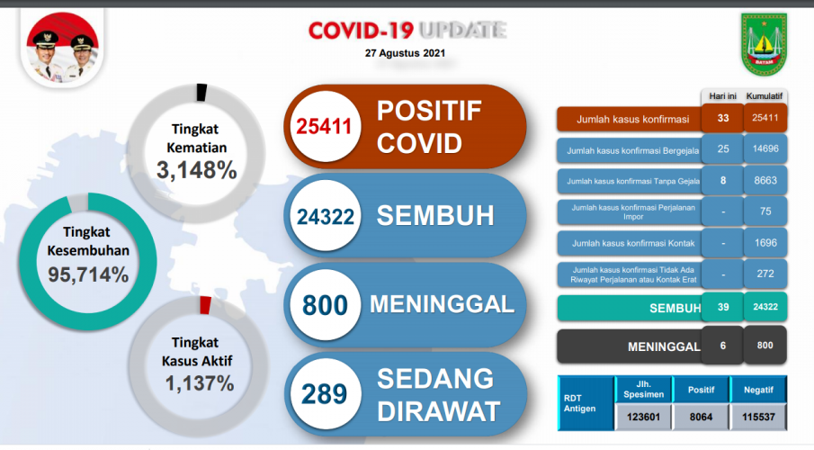 Sementara itu jumlah pasien Covid-19 yang meninggal dunia bertambah 6 orang. Sehingga total pasien Covid-19 yang meninggal dunia hingga Jumat (27/8/2021) sebanyak 800 orang atau sekitar 3,148 persen.
