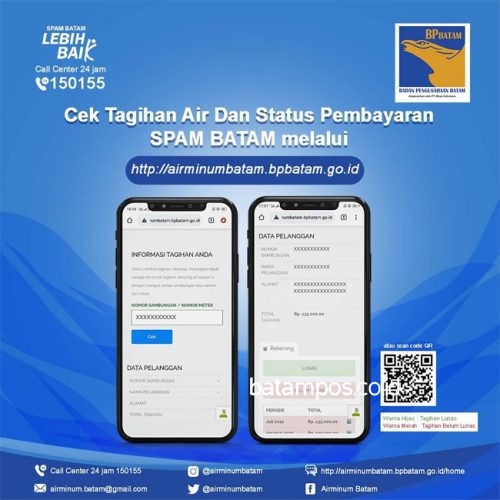batampos.co.id – Bagi Anda yang ingin mengetahui kubikasi pemakaian dan status pembayaran air SPAM Batam dapat diakses melalui Saluran Komunikasi Kepelangganan di http://airminumbatam.bpbatam.go.id atau dengan cara scan barcode yang ada pada gambar di atas.