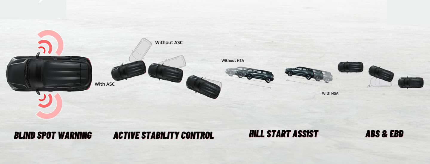 Untuk mencegah kendaraan mundur di tanjakan, tersedia Hill Start Assist (HSA). Selain itu, Mitsubishi Xforce pada varian tertinggi Ultimate Diamond Sense dilengkapi dengan Blind Spot Warning (BSW) yang akan memberikan peringatan jika ada kendaraan di titik buta.