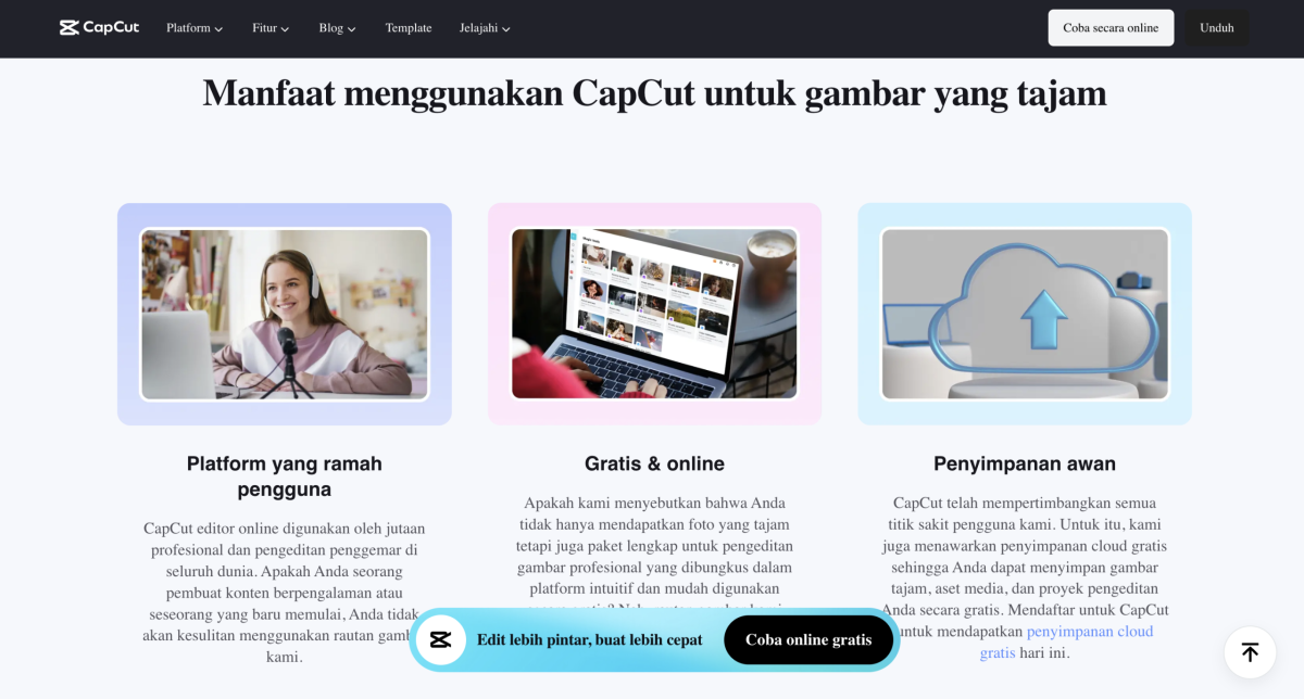 Platform ini memberikan kemudahan bagi siapa saja yang ingin meningkatkan kualitas gambar dengan cepat, praktis, dan tanpa proses editing yang kompleks. Baik untuk kebutuhan pribadi, media sosial, maupun bisnis digital, tools editing online seperti CapCut dapat menjadi solusi yang efisien.