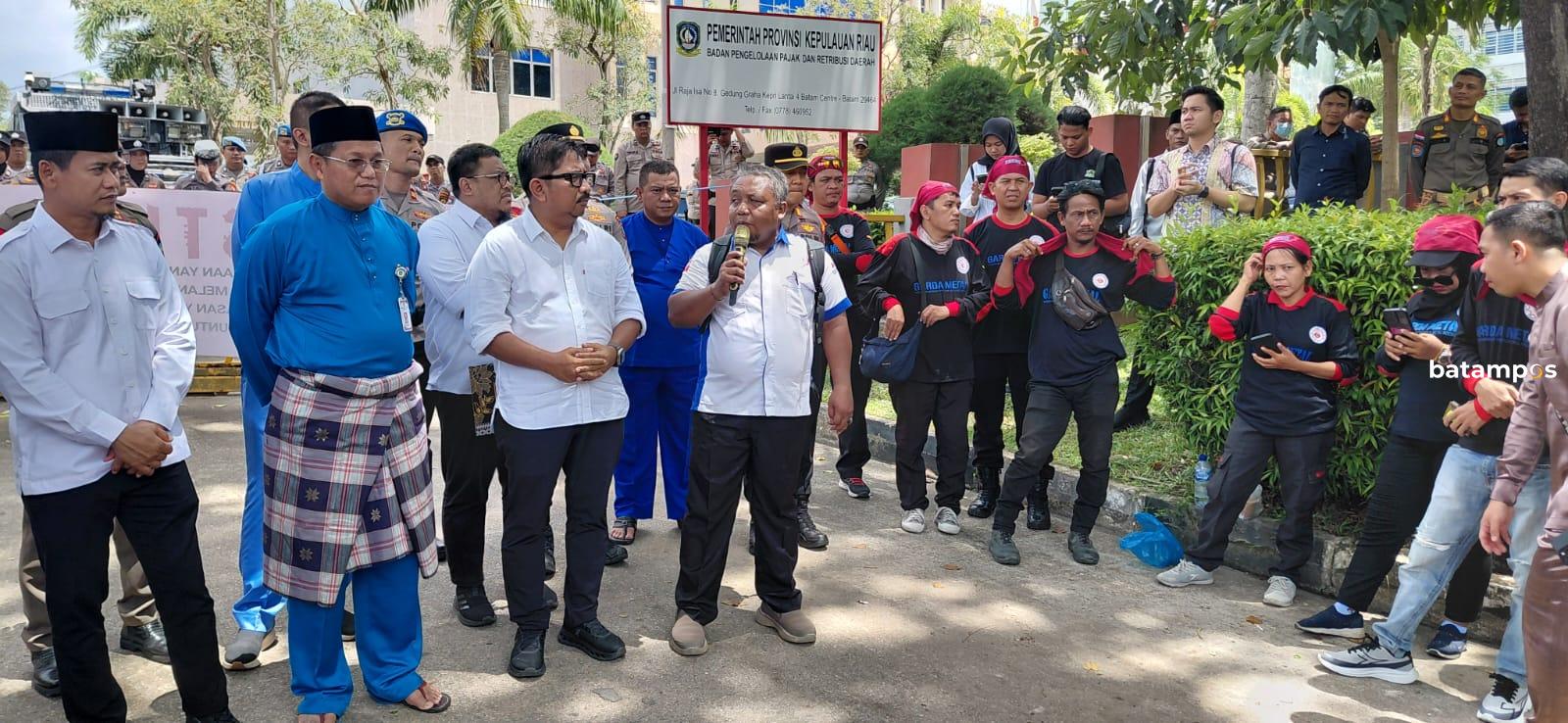 batampos – Aksi unjuk rasa puluhan buruh di depan Gedung Graha Kepri, Kota Batam, Kamis, (16/4), berujung dialog langsung dengan pemerintah daerah. Sejumlah tuntutan yang disuarakan pekerja, mulai dari isu nasional hingga persoalan teknis di tingkat lokal, mendapat tanggapan dari pejabat terkait.