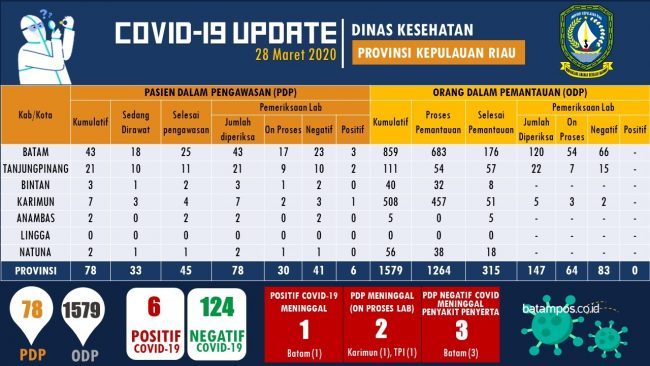Berdasarkan data yang dikeluarkan Dinas Kesehatan Provinsi Kepri, Sabtu (28/3/2020), saat ini jumlah Pasien Dalam Pengawasan (PDP) di Provinsi Kepri berjumlah 78 orang.