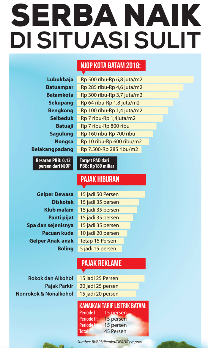 Bahkan terhitung Januari 2018, tarif PBB juga naik akibat kebijakan Pemko Batam yang melakukan penyesuaian Nilai Jual Objek Pajak (NJOP) tanah dan bangunan. NJOP merupakan penentu besaran PBB yang harus dibayarkan. (Selengkapnya lihat grafis).