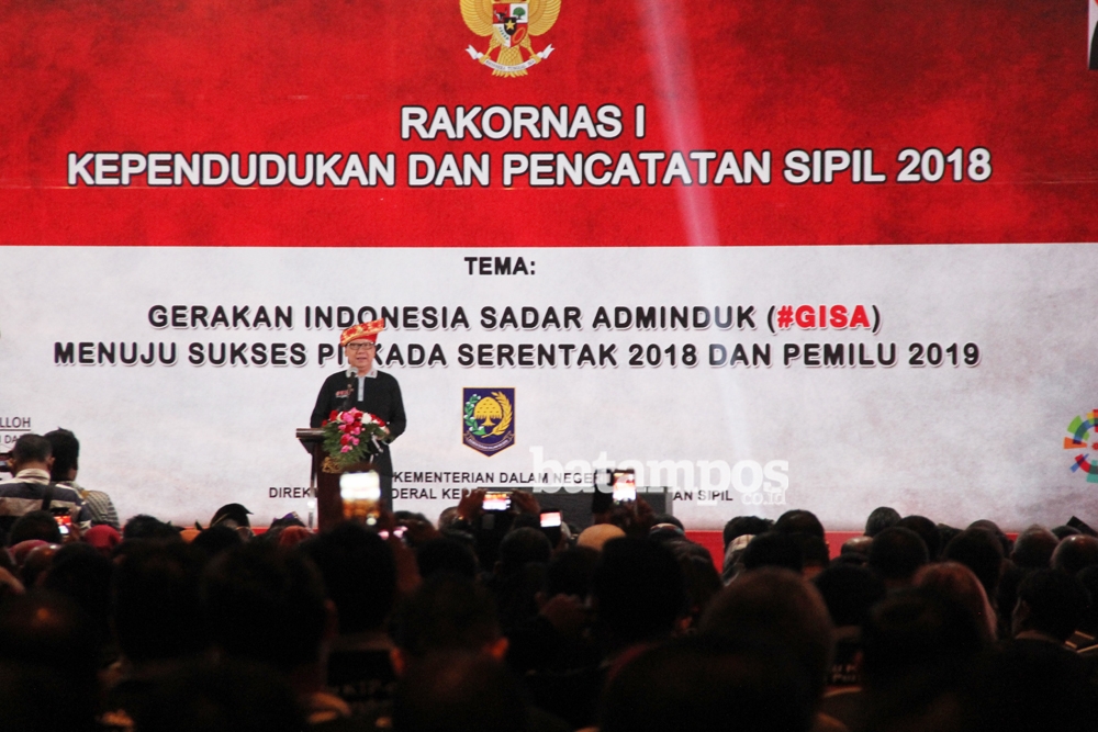 Mentri Dalam Negeri Tjahjo Kumolo memberikan pengarahan sekaligus membuka acara Rakornas Kependudukan dan Pencacatan Sipil di Hotel Harmoni One Batamcenter, Kamis (8/2). F Cecep Mulyana/Batam Pos