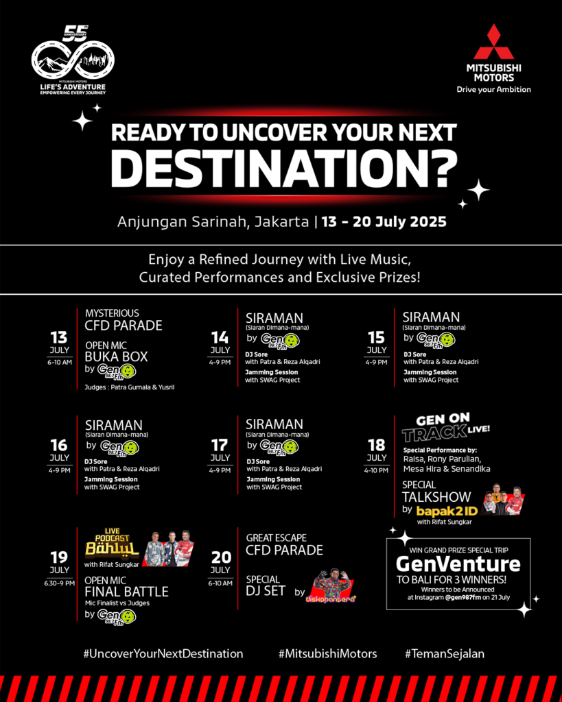 Tak hanya itu, selama satu minggu penuh ke depan, pengunjung dapat melakukan beragam aktivitas menarik dengan tema destinasi dan menikmati rangkaian acara istimewa, termasuk: Penampilan spesial dari Raisa, Rony Parulian, Mesa Hira dan Senandika, Talkshow bersama Rifat Sungkar, Live On-Air seru bersama Gen FM, Open Mic bareng Gen FM dan kehadiran instalasi kreatif Sky Explorer yang menjadi bagian dari kolaborasi unik antara Mitsubishi Motors, Garuda Indonesia, dan Tahilalats. MMKSI juga bekerjasama dengan Gen FM dan Bapak2Id untuk memeriahkan aktivitas Mystery Box di Anjungan Sarinah kali ini.