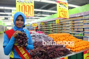 Karyawati Hypermart Nagoya Hill menunjukan buah anggur yang siap ditawarkan kepada konsumen, Jumat (7/4). F Cecep Mulyana/Batam Pos