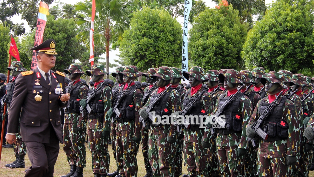 Kapolda Kepri Irjen Sam Budigusdian memeiksa pasukan upacara pada acara HUT Polda Kepri ke-12 di Mapolda Kepri, Jumat (3/3). F Cecep Mulyana/Batam Pos