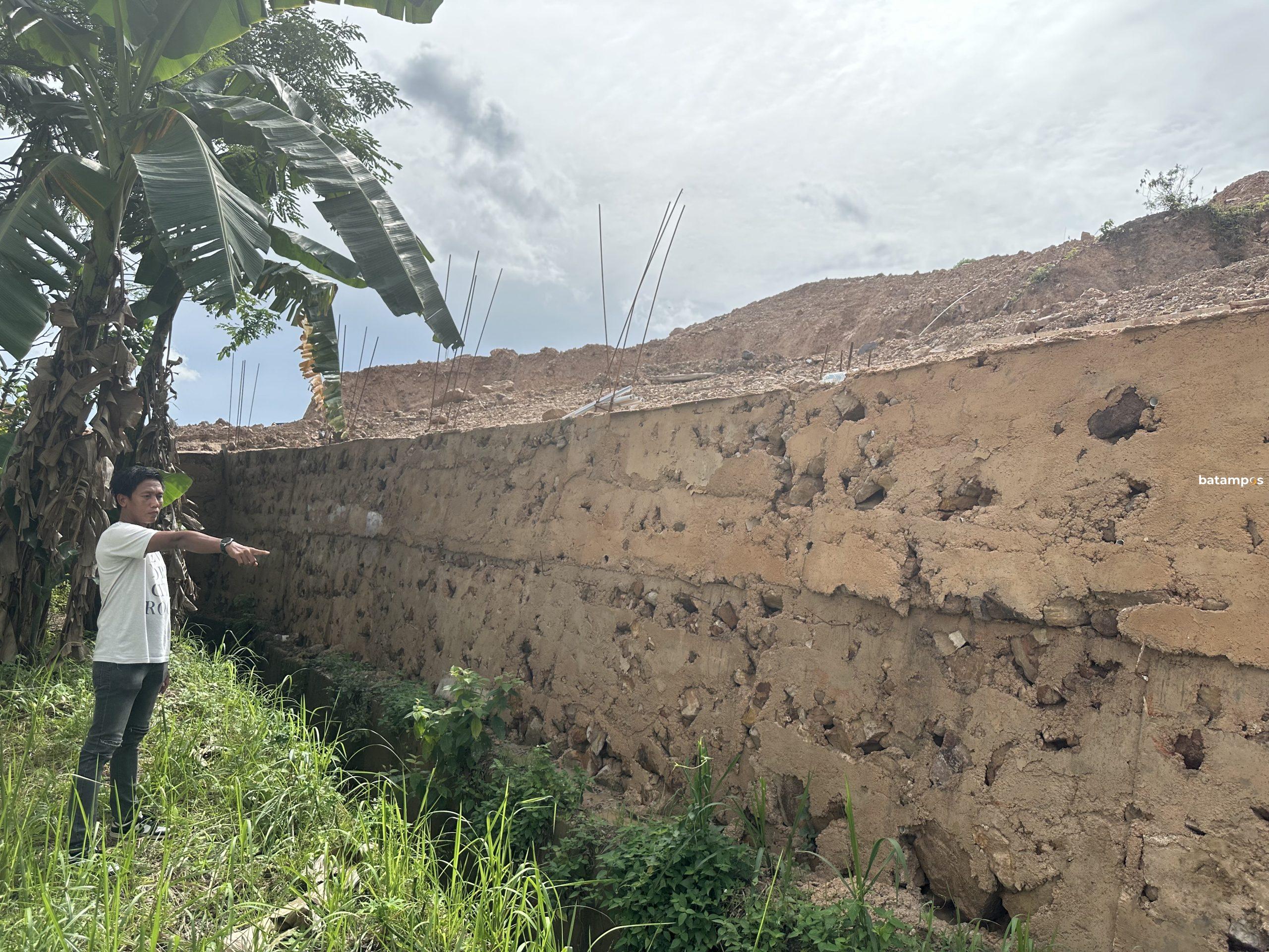 Warga menunjukkan batu miring yang dibangun pihak pengembang tepat di bawah bukit. Foto. Yofi Yuhendri/ Batam Pos