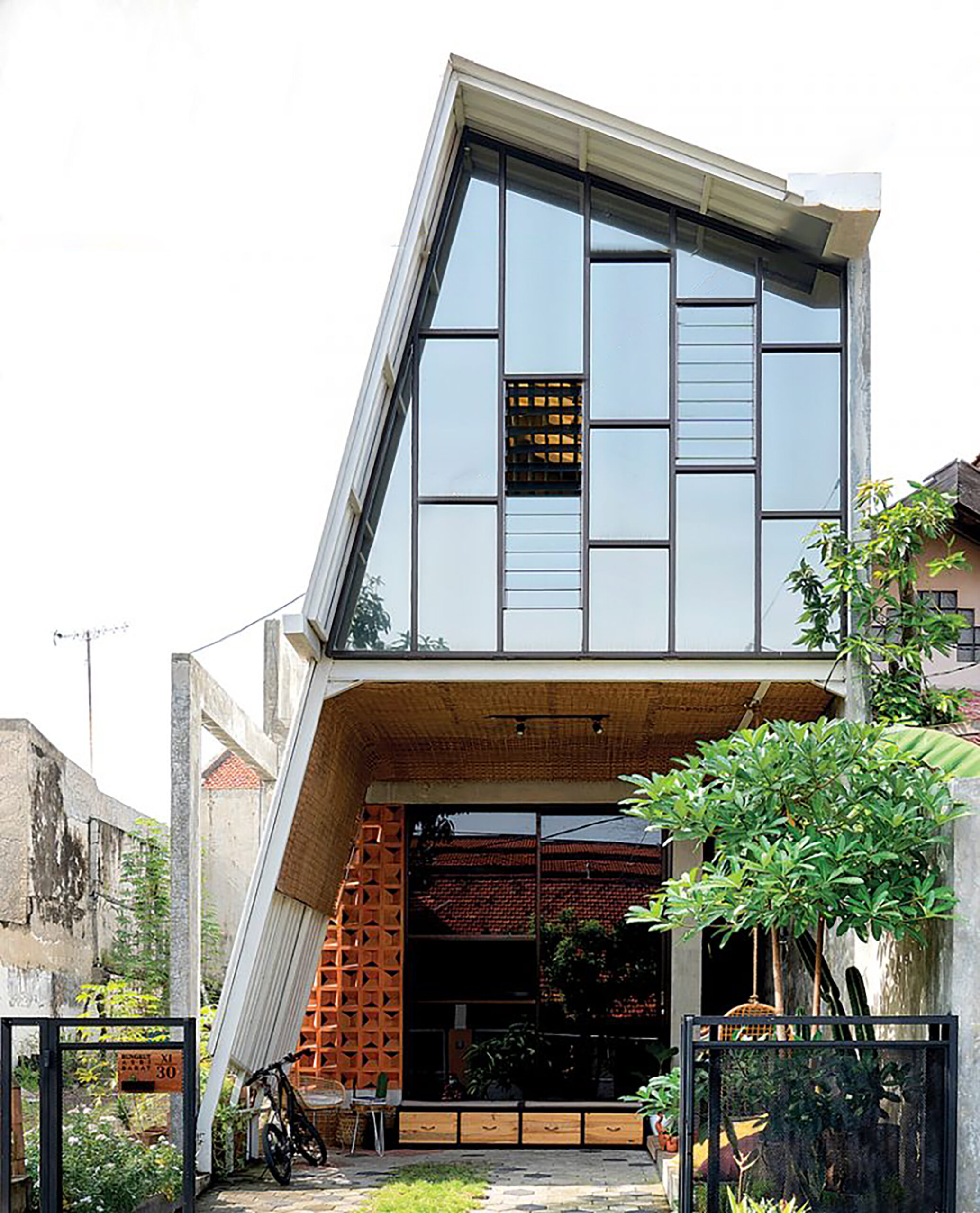 Fasad rumah ini menjadi poin pertama yang membuat orang menoleh. Bentuknya asimetris dengan salah satu sisi dibuat miring. Sejak awal, Azwar Efendy selaku arsitek prinsipal rumah tersebut ingin membuat sesuatu yang ikonik. Dengan bentuk fasad seperti itu, rumah tersebut terlihat berbeda dibandingkan rumah-rumah di sekitarnya meski bentuknya tidak lebar.