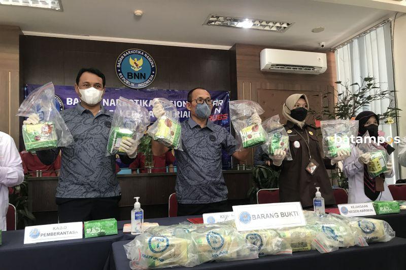 BNNP Kepri memperlihatkan barang bukti narkoba sebanyak 11 Kg dari pengedar narkoba jaringan internasional. (ANTARA/Yude)