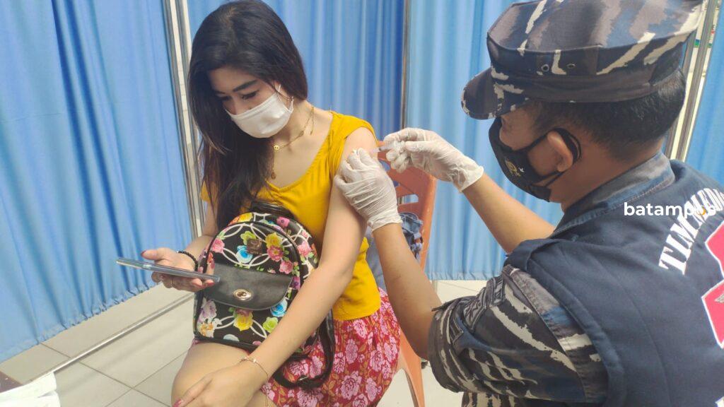 Petugas kesehatan dari Lanal TBK sedang memberikan suntikan vaksin kepada warga di pelabuhan domestik.