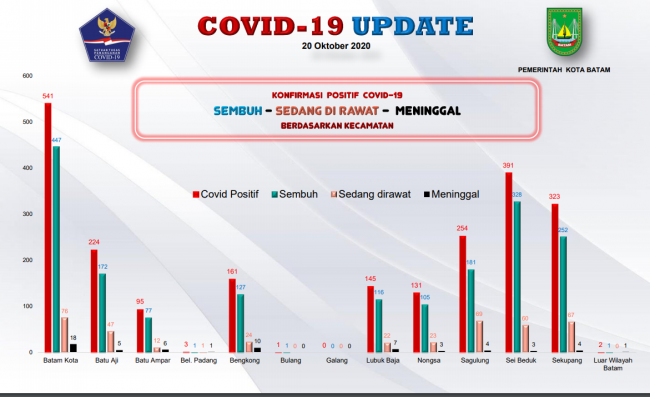 1. Batam Kota terdapat 541 orang. Dengan rincian 447 dinyatakan sembuh, 76 orang dalam perawatan dan 18 orang meninggal dunia.