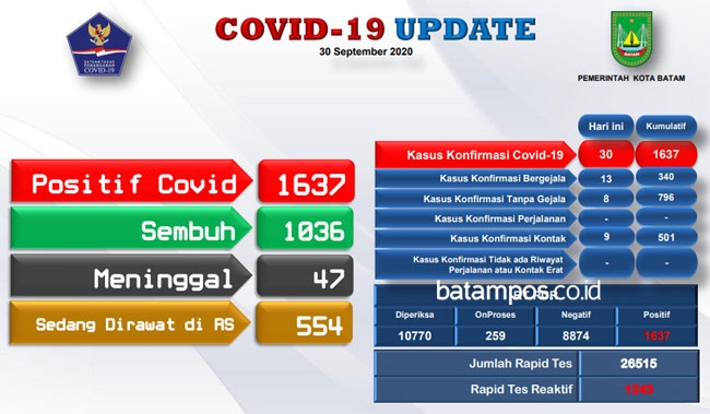 batampos.co.id – Jumlah pasien Covid-19 di Kota Batam bertambah 30 orang pada Rabu (30/9/2020).
